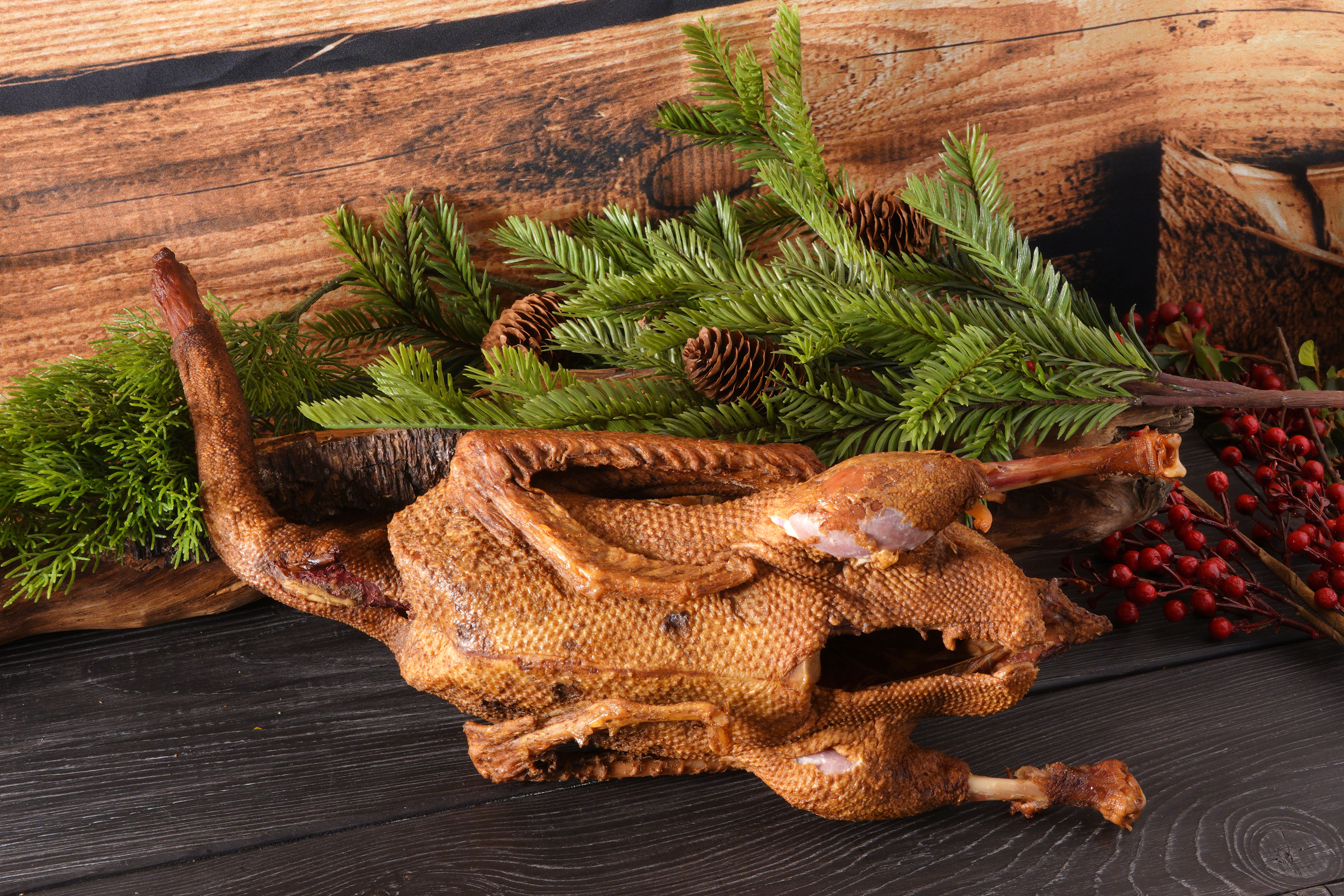 Копченый дикий гусь ― редкий полезный и вкусный деликатес. Гусиная тушка богата витаминами А и С, отличается высоким содержанием магния, кальция и цинка. Она также улучшает состояние сосудистой и сердечной систем, рекомендуется к употреблению в периоды повышенной умственной нагрузки. Продукт менее жирный, чем остальные птицы. Мясо нежное, без вредных примесей или антибиотиков, в процессе приготовления покрывается приготовления золотистой корочкой. Сочетается с фруктовыми сладкими и ягодными кисло-сладкими соусами. На стол моет подаваться с запеченными овощами, фруктами или со свежей зеленью.